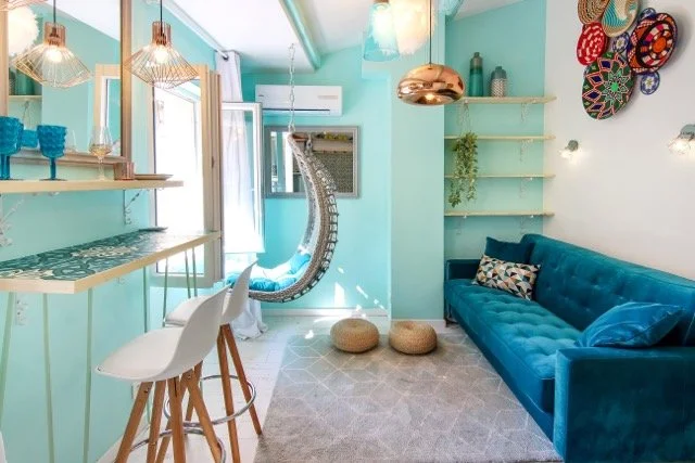 Ce studio au coeur de la ville était triste et vieillot. Le turquoise, le vert d’eau et le bois amènent la nature et l’harmonie dans ce lieu unique, où l’on s’imagine dehors, source éternelle d’inspiration et de calme. La balançoire nous relie à notre âme d’enfant et à la joie.