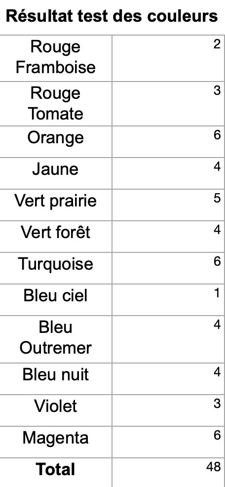 Faites bien attention notamment aux 2 rouges (rouge framboise et rouge tomate) de bien les différencier dans votre comptabilisation pour ne pas fausser votre interprétation.