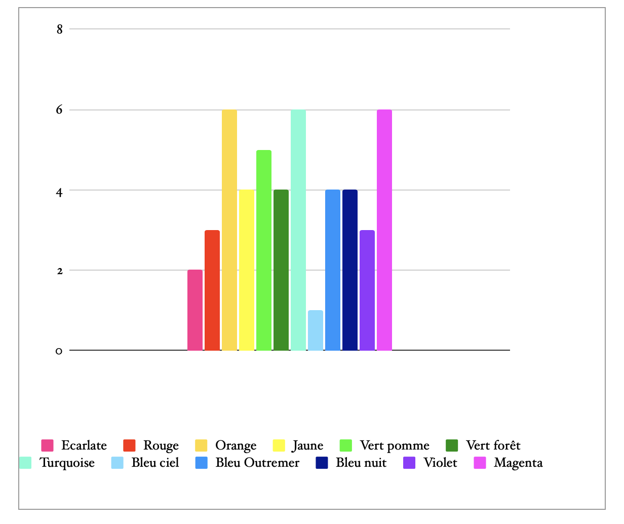Enfin, RV sur l’onglet 3 où vous allez voir apparaître votre test des couleurs sous forme d’un diagramme avec 12 bacons de couleurs différentes. La hauteur du bâton indique votre goût pour la couleur. Lorsque vous avez 8/8 à une couleur, cela signifie que vous avez conservez toutes les cases de cette couleur. Je vous montre un exemple de diagramme auquel vous aurez accès sur l’onglet 3:
